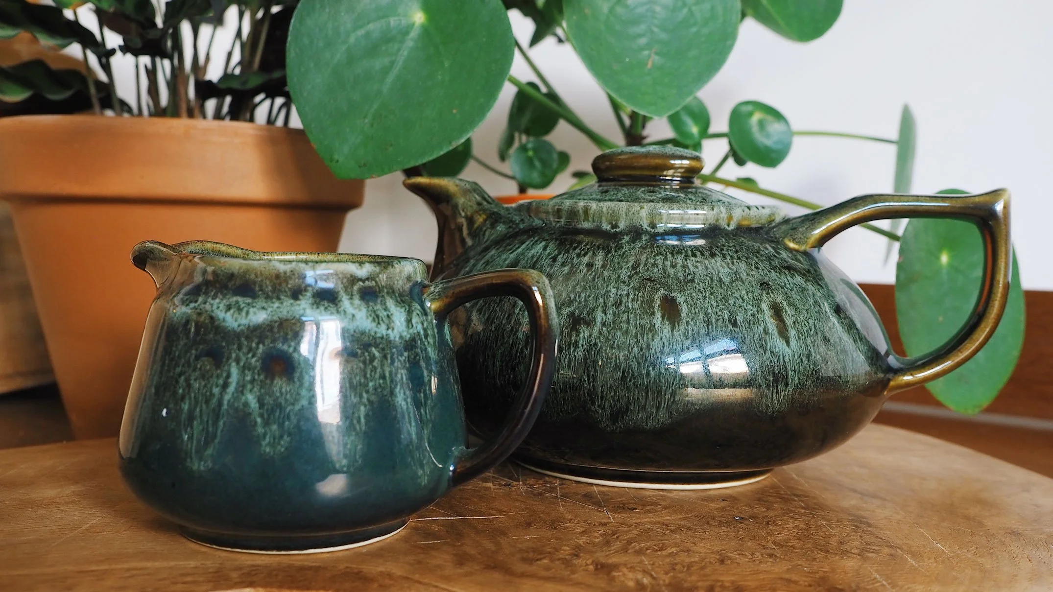 Now you know we love a bit of Fosters Pottery, however this Green/Turquoise glaze is a bit rare and special! We don’t come across it too often, so this makes this Teapot and Milk Just a bit spesh!
