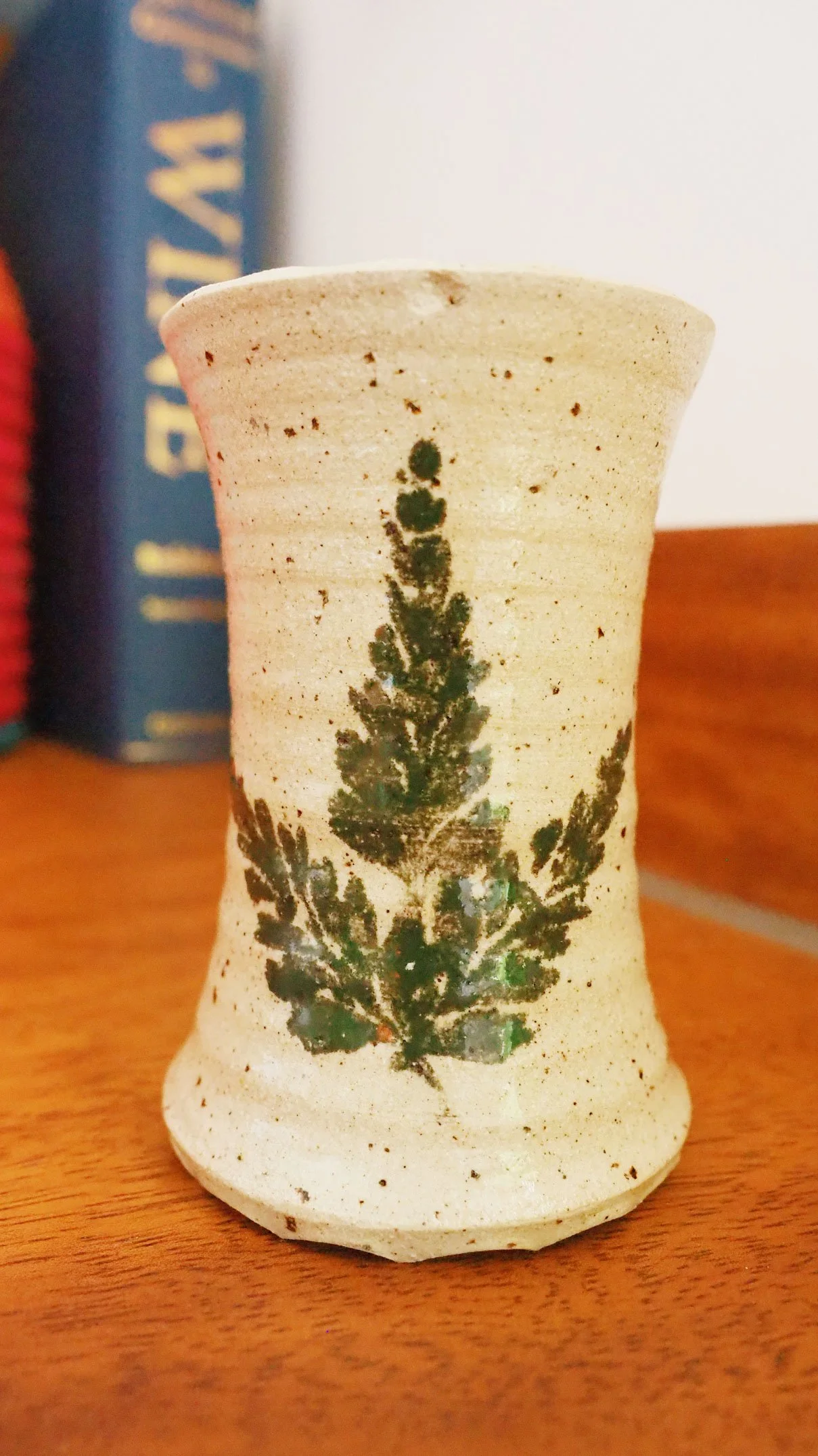 We love a vase, as you can tell from most of our collections! sometimes a small vase is great addition to add to those large collections. This cutie is a speckled cream with a fern imprint on the front. Shes handmade, which makes her extra special than mass produced homeware