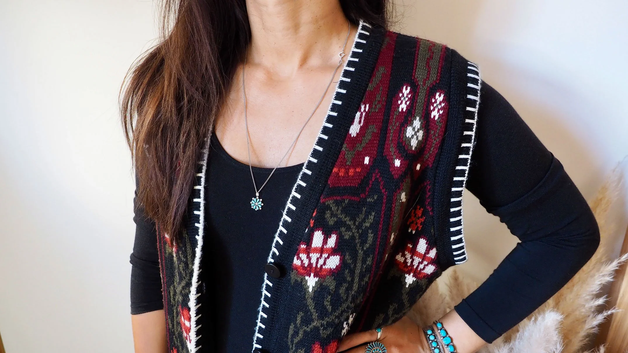Tis the season for layering! And nothing does it better than a knitted waistcoat. Big enough to fit over a chunkier knit or loosely over a polo neck. Team with your 501's, chunky boots and a big hat to give this folksy 70s floral print a perfect pairing.