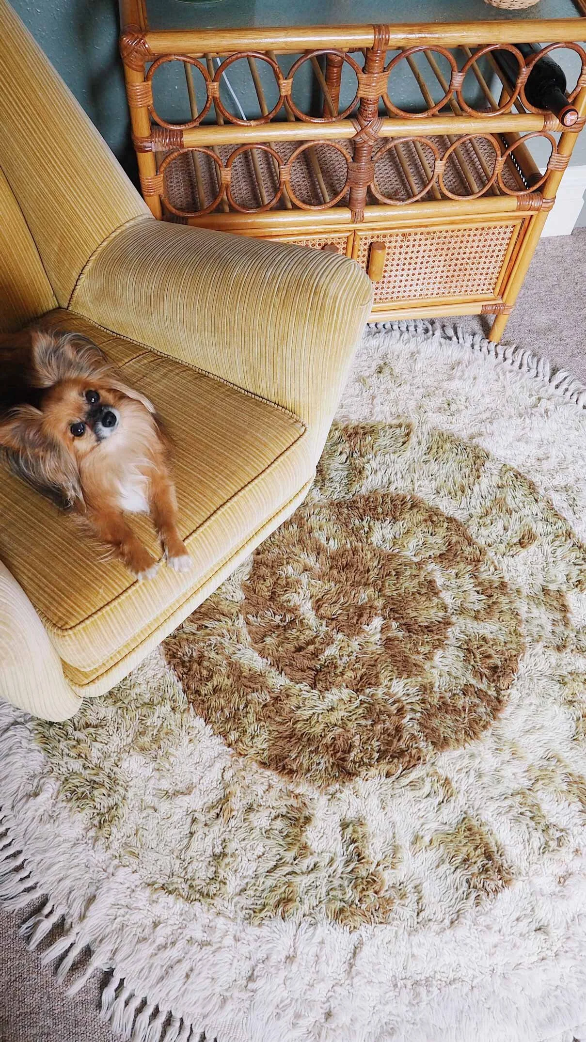 Were living our best 70s Boho Rug fantasies with this baby! This rug has a Cream, Green and Brown swirl going from dark in the centre to light at the outer edges, and some cute tassels to finish!